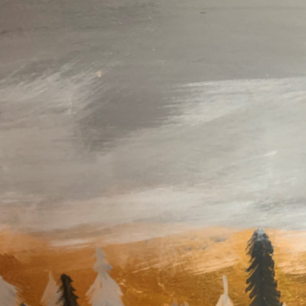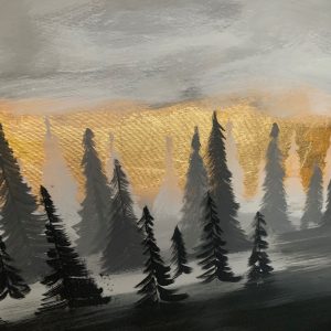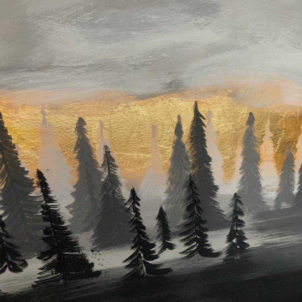 “Gold Sky” jest obrazem, który przykuwa wzrok ze względu na swoją niezwykle prostą formę przywołującą na myśl szkice tuszami. Jednak gdy zainteresowany przyjrzy się bliżej i dokładnie obejrzy płótno, zobaczy spokojna pracę pędzla oraz celowo, przemyślanie użyte pozłacane elementy nadające klasę całemu dziełu. To kolejny obraz akrylowy przedstawiający piękno natury. W tym przypadku autor ręcznie malowanego obrazu przenosi nas w góry i zabiera na punkt widokowy, z którego możemy wspólnie delektować się złotym zachodem słońca, które chowa się za iglastym lasem na wzgórzu. Jest to obrazz pokazujący piękno i cud matki natury.