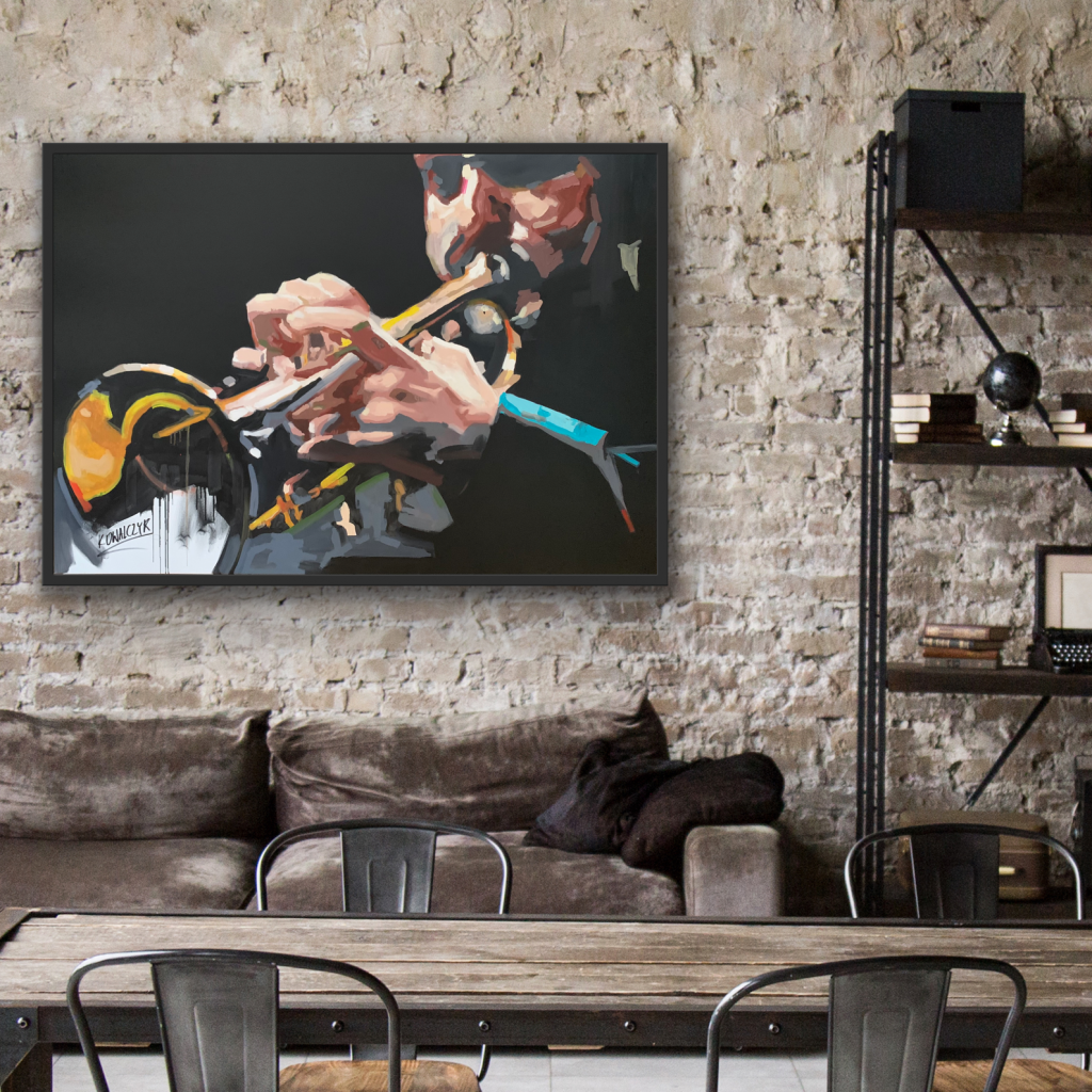 Lekki jazzowo-klubowy klimat bijący z płótna zachwyci niejednego konesera dobrych dzieł sztuki. Przedstawiony portret olejny na pierwszy rzut oka przywodzi na myśl nastrojowy, kojący nerwy koncert na którym aż chcesz być. Nieco klasyki w muzycznym ujęciu. Obraz “Grajek” to portret, który powstał tradycyjnymi metodami. Nawiązanie do wcześniej wspomnianego, lekkiego jazzowego stylu sprawia, że patrząc na to dzieło od razu wiesz w jakim miejscu wyglądałoby idealnie. Męski klub, pokój do pokera, klub, piwniczka z winami, jadalnia czy też salon. Płótno doskonale będzie się prezentować w wielu pomieszczeniach.