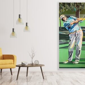 Duży olejny obraz na płótnie przedstawia realnych rozmiarów postać mężczyzny grającego w golfa. “Golf” będzie idealnym nabytkiem nie tylko dla miłośników tego fascynującego sportu, ale i dla tych, którzy chcą nadać wyjątkowego i dynamicznego charakteru swoim wnętrzom. Barwy jakie zostały użyte na tym obrazie olejnym będą kompatybilne zarówno z nowoczesnymi jak i klasycznie urządzonymi pomieszczeniami. Intrygujący wyraz twarzy namalowanego na płótnie mężczyzny ukazuje skupienie i determinację, co powoduje, że doskonale ujęty ruch gra tutaj główną rolę.