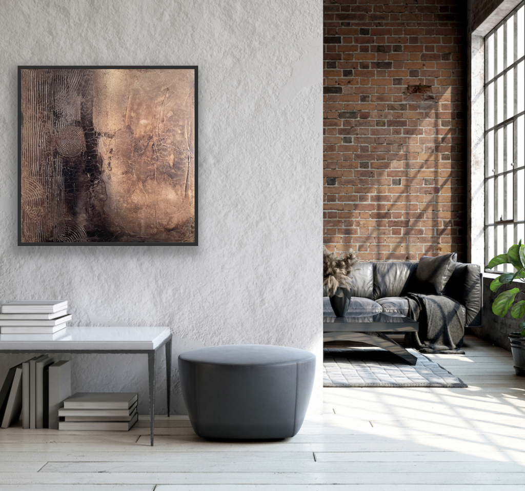 Ręcznie malowany, postarzany obraz “Loft” 100×100 . Prestiż i elegancja