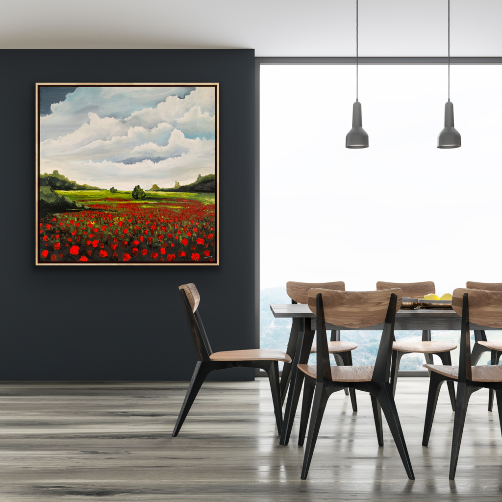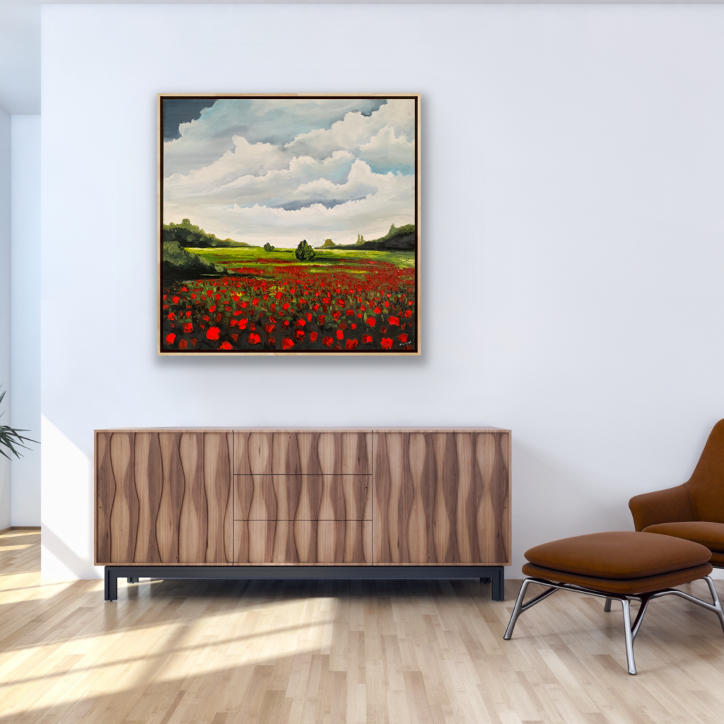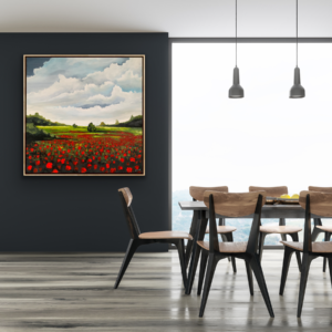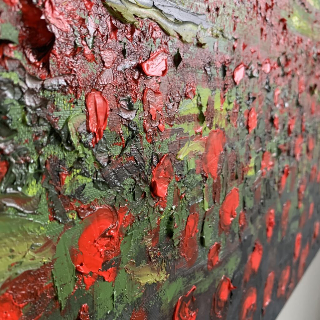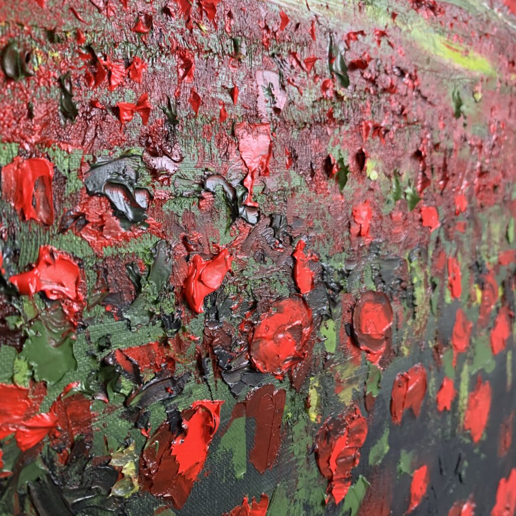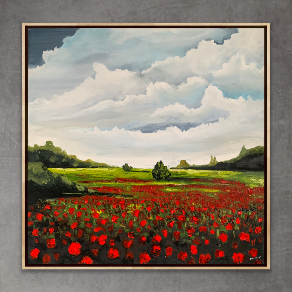 Ręcznie malowany obraz „POPPIES” przedstawia malowniczą łąkę pełną jaskrawoczerwonych maków, które stanowią główny punkt kompozycji. Ich intensywny kolor kontrastuje z zielenią trawy i liści drzew, tworząc wrażenie bujnej, lecz spokojnej natury.