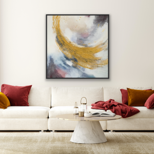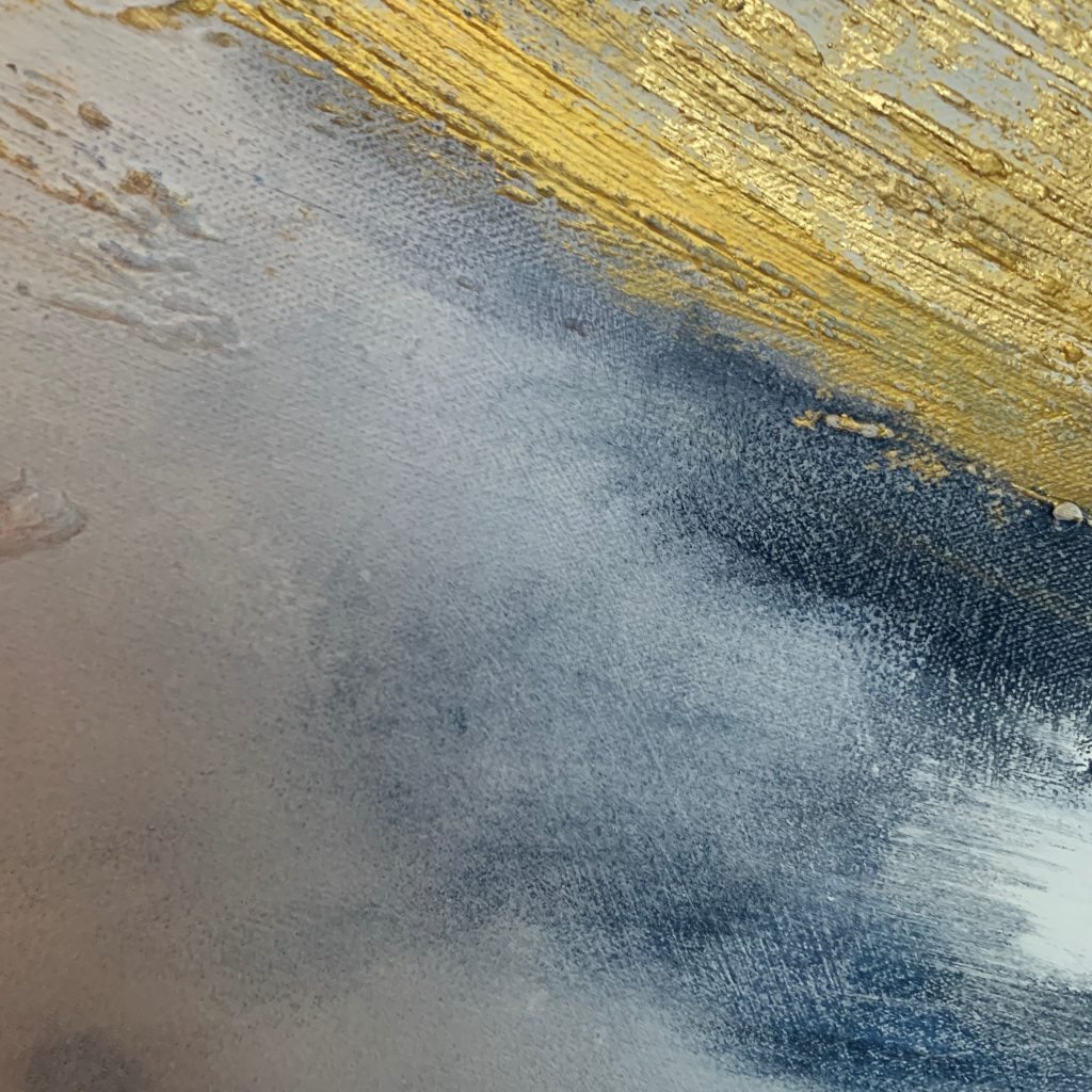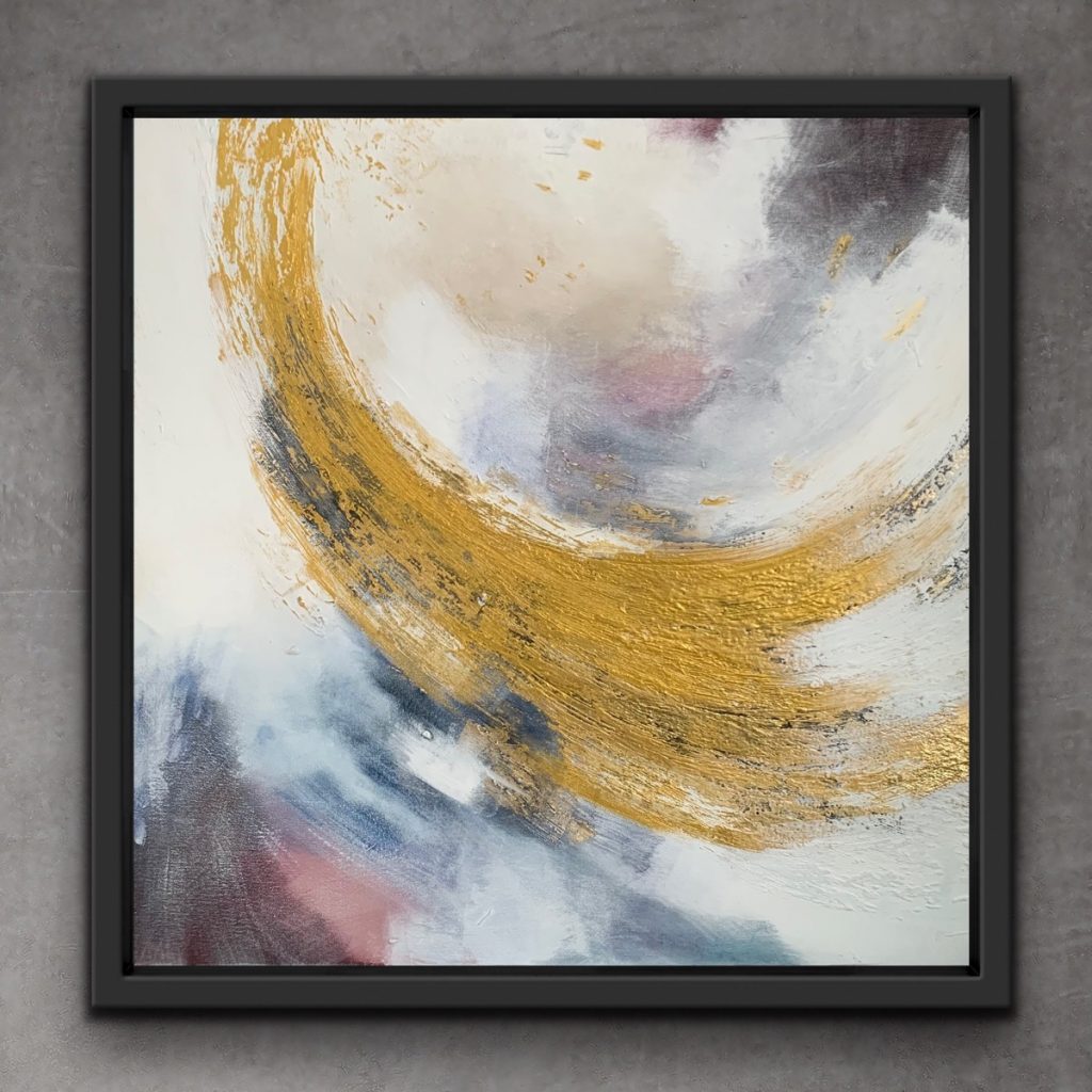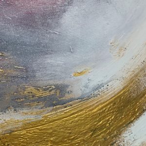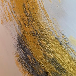 “Spin” to ręcznie malowany obraz, który powstał przy użyciu kilku technik. Autor zastosował strukturę na płótnie oraz szlagmetal. Jasne, pastelowe kolory w połączeniu z odważnym, złotym akcentem zdecydowanie wyróżniają to dzieło.