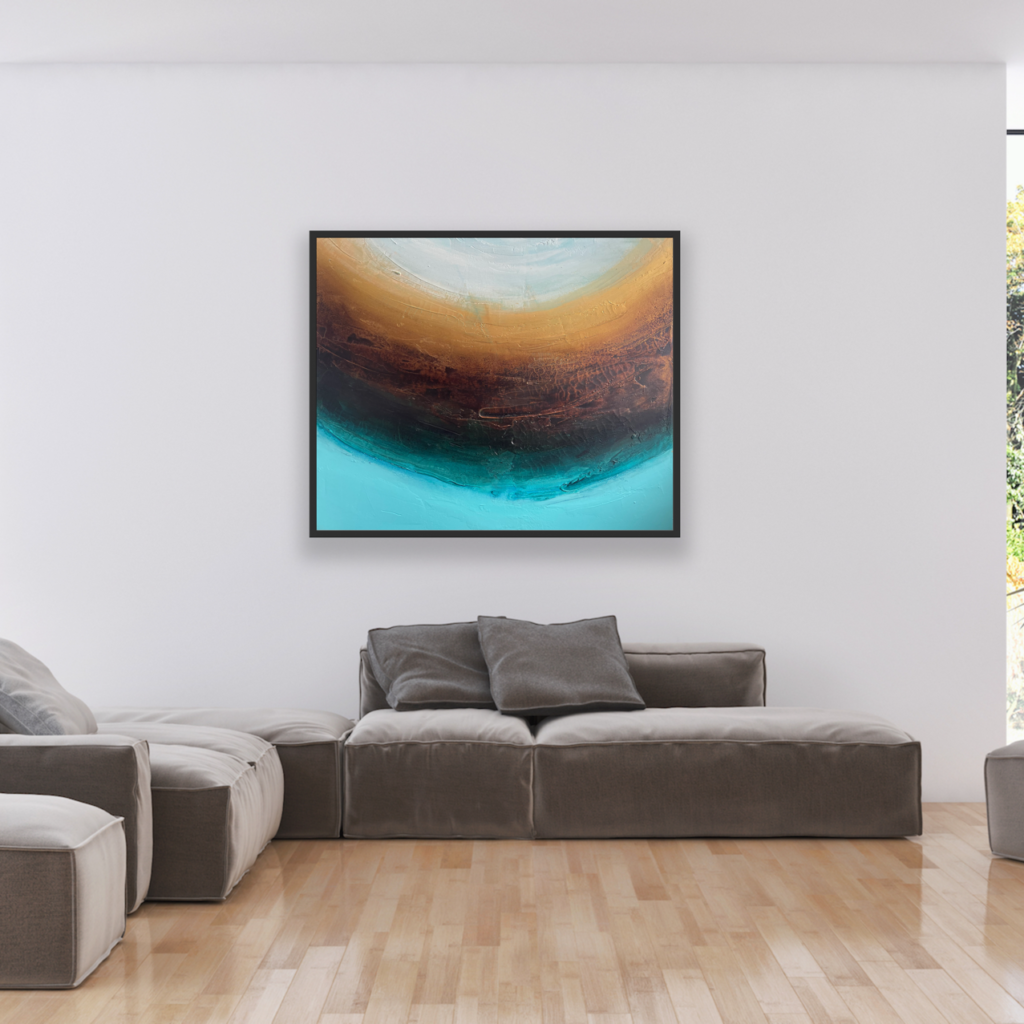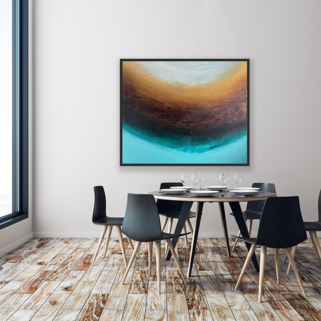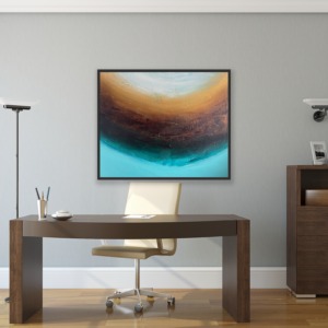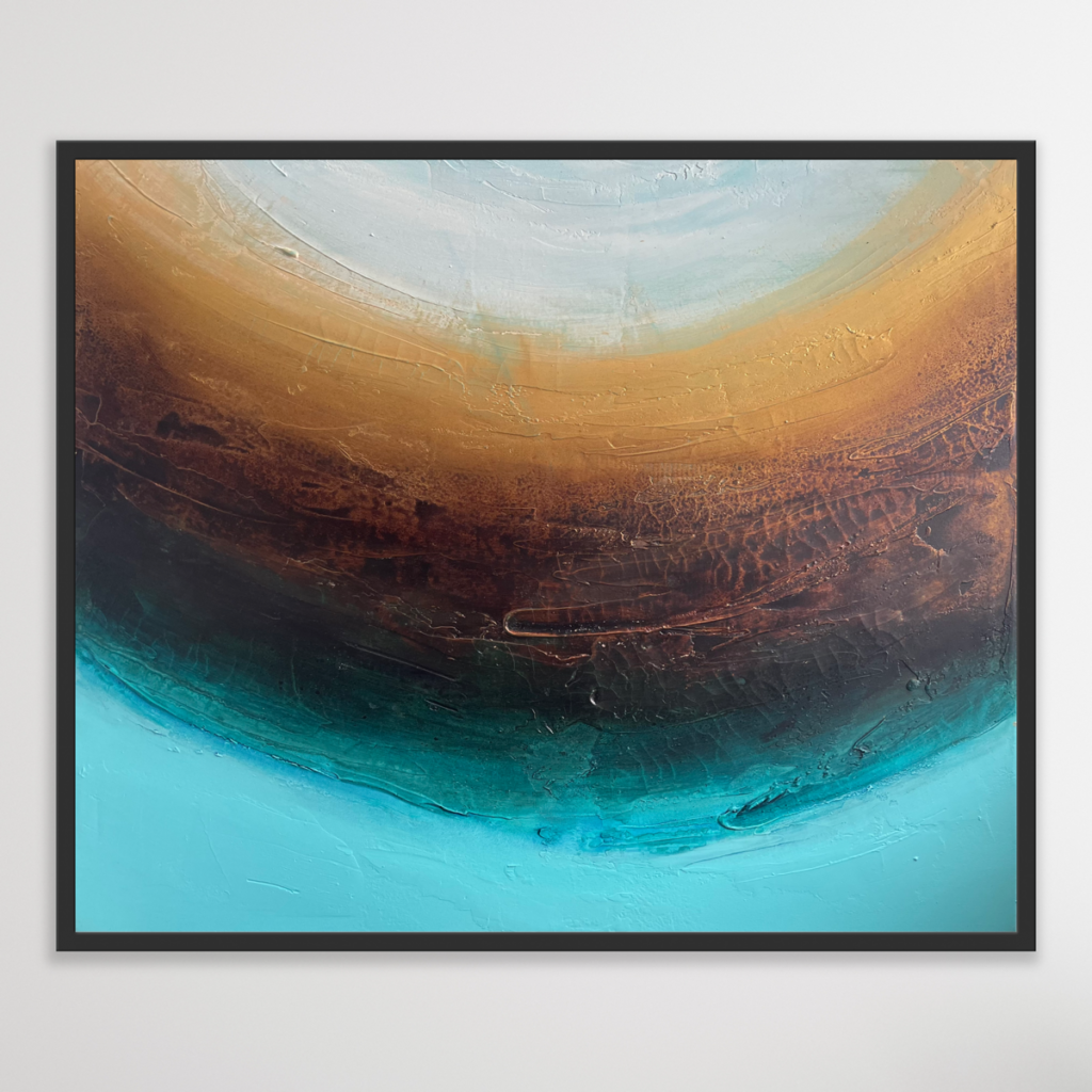 Obraz ten przenosi widza w inny wymiar, gdzie kolor błękitu działa jak spokojne tło, podkreślając majestatyczność złota i elegancję brązu. Ta kombinacja kolorów nadaje dziełu równowagę i harmonię, tworząc wrażenie spokoju i równowagi.