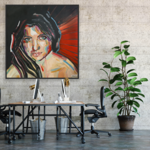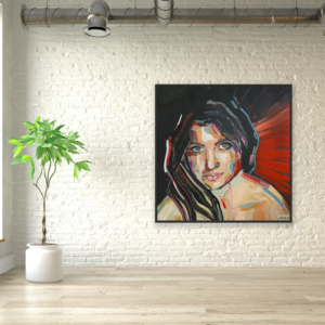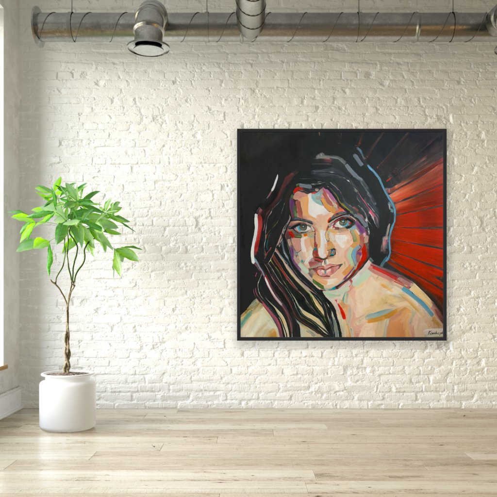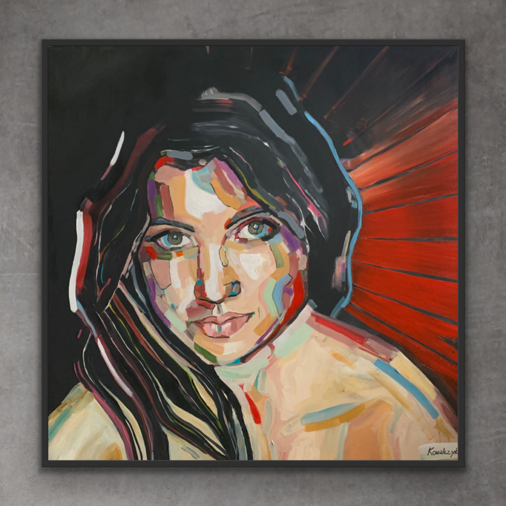 Ręcznie malowany obraz “Black Screen” to portret przedstawiający kobietę o intrygującym i zalotnym spojrzeniu. Mimo użycia wielu barw dla podkreślenia kształtów i cieni zdecydowanie wybija się czerń tła oraz czerń włosów modelki. Intrygujące spojrzenie młodej kobiety, sprawi że przestrzeń, w której znajdzie się obraz zyska wyjątkowy charakter. Czarne tło zdecydowanie akcentuje postać uchwyconą na płótnie.