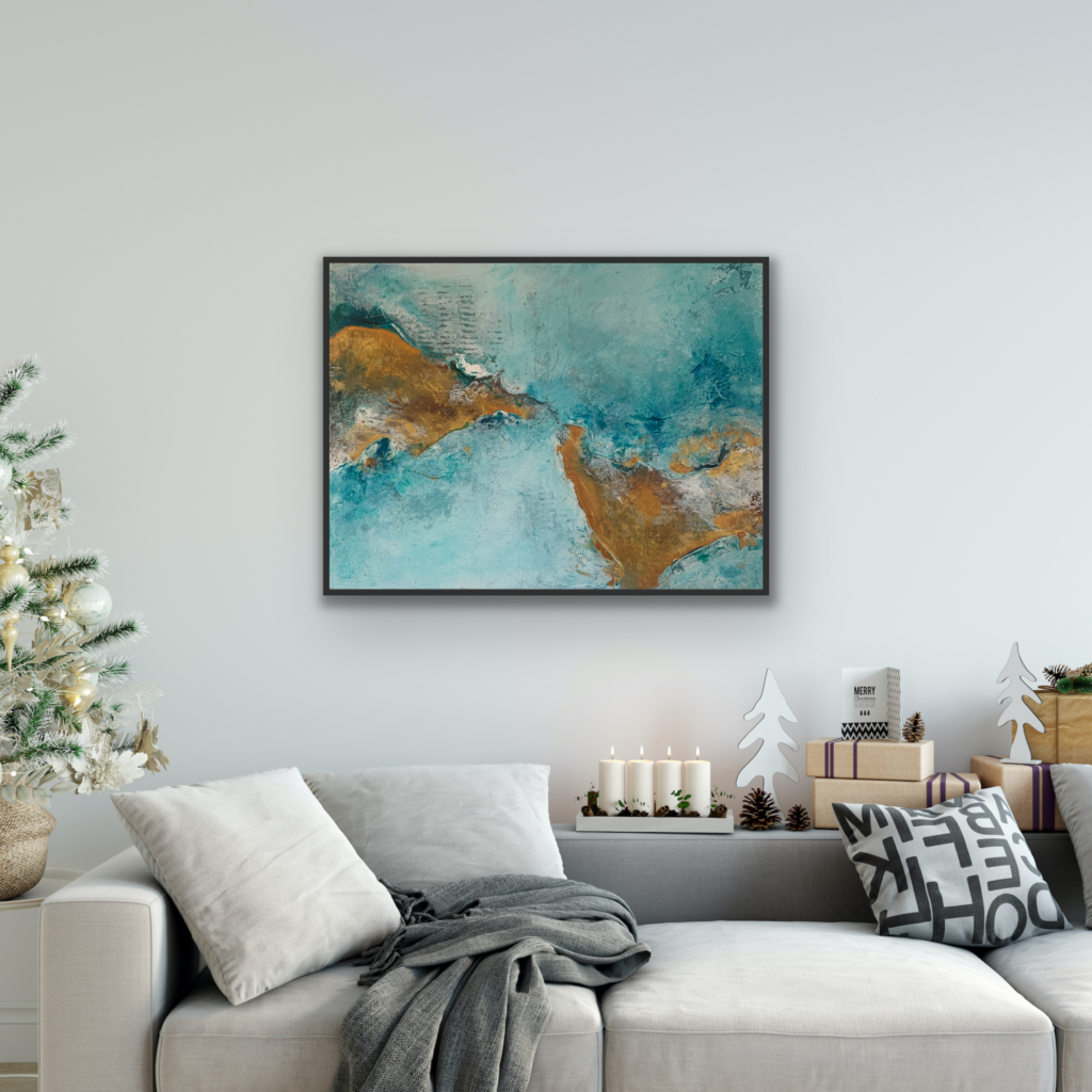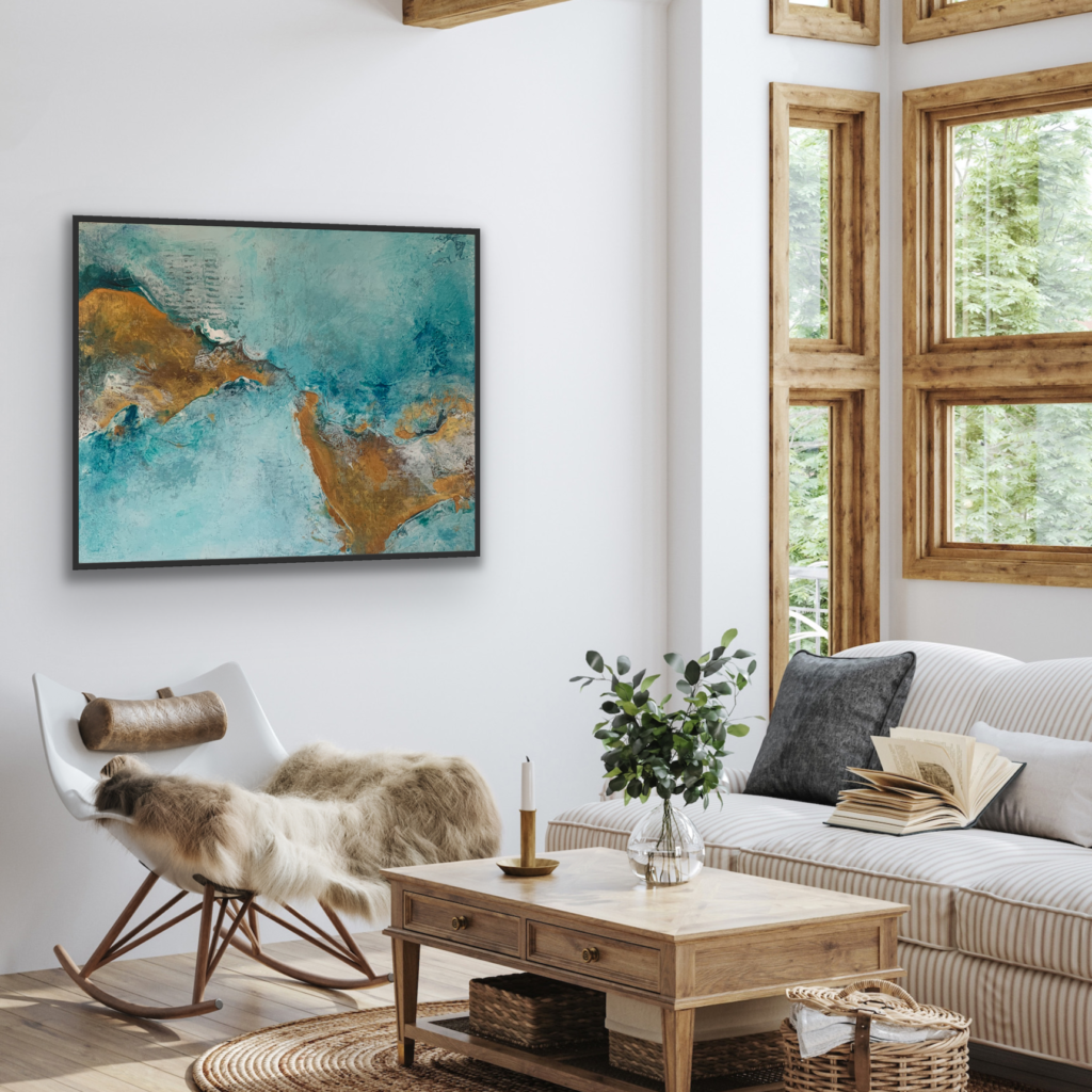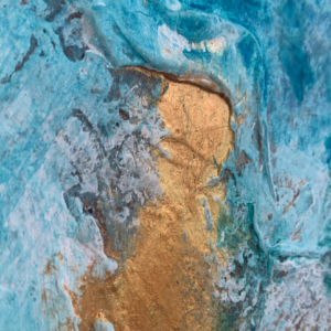 To abstrakcyjne dzieło sztuki jest niezwykle wyraziste i zachęca do interpretacji. Jego harmonijna kompozycja niebieskich odcieni w połączeniu z złotym szlakiem tworzy fascynującą opowieść lub inspiruje do osobistych refleksji. Jako centralny punkt w pomieszczeniu, ten obraz przyciąga uwagę i zaprasza do zanurzenia się w jego głębi.