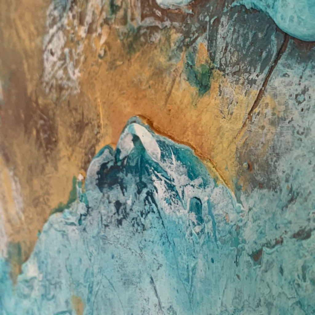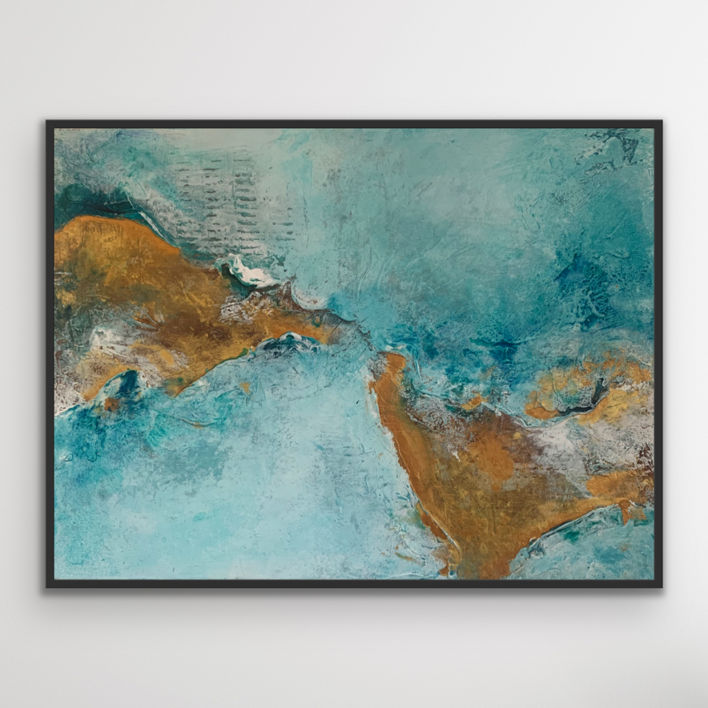 Centralnym elementem tego dzieła jest złoty szlak przecinający obraz. Ten złoty ślad może symbolizować ścieżkę, przestrzeń, czy też być metaforą dla drogi, którą podążamy w życiu. Złoty kolor dodaje wyrafinowanego blasku i elegancji, stając się punktem centralnym całej kompozycji. Złote przełamanie umiejętnie wplecione w kompozycję, dodając jej elegancji i blasku. Złota plama w środkowej części obrazu, która przykuwają uwagę, nadaje całości wyjątkowego charakteru.